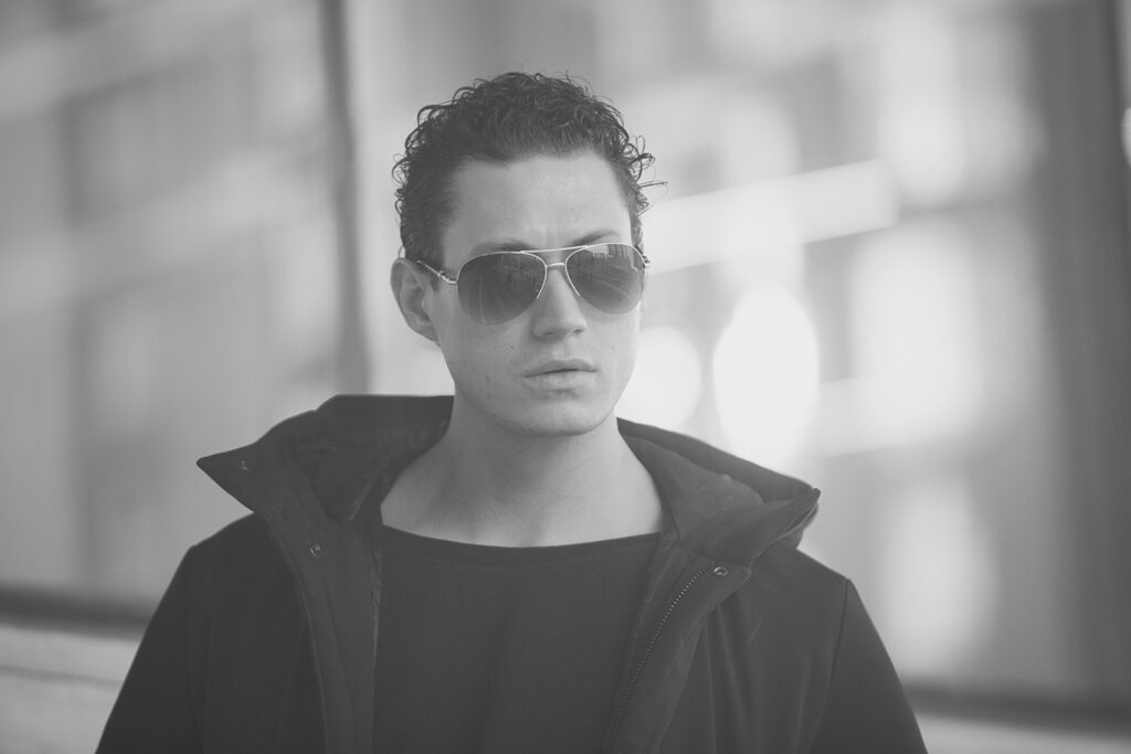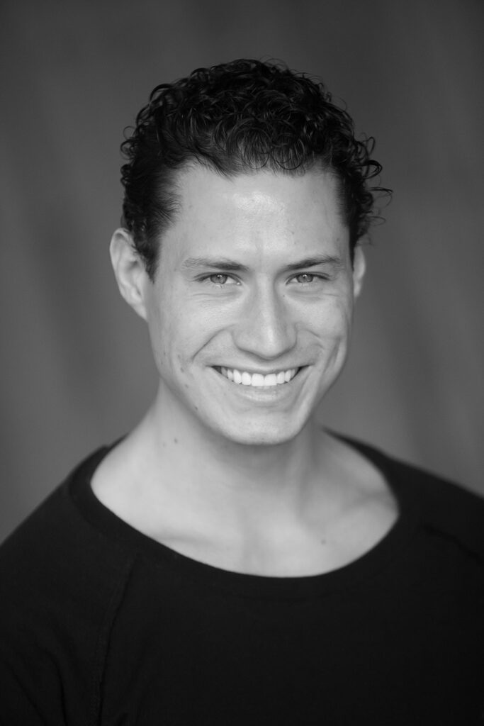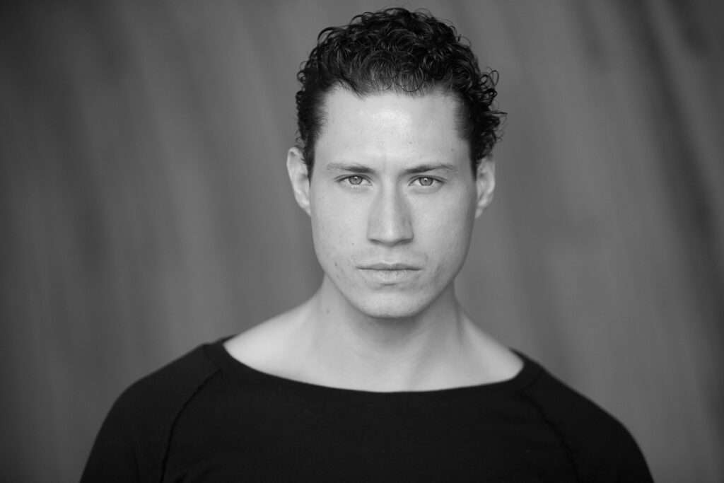 A young man with short, curly dark hair and a serious expression looks directly at the camera. He is wearing a dark shirt, and the blurred, neutral background enhances this classic black-and-white Calgary Acting and Modelling Headshot. - Jodi O Photography